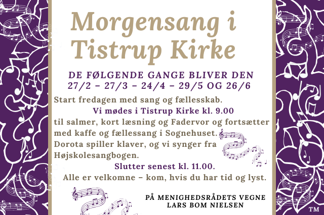 Morgensang i Tistrup Kirke Morgensang i Tistrup KirkeTISTRUP 26-01-2026, 11:57 - Tistrup Forfatter: Tistrup Mediehus Første gang 30. junuar kl. 9.00 × 21-01-2026 - Navnene på konfirmanderne lørdag d. 2. maj 07-01-2026 - Aftengudstjeneste 21-12-2025 - Julehilsen fra TM 07-12-2025 - Tag med på rejse med Anne-Vibeke i et foredrag. 04-12-2025 - Tistrup Filmklub viser film i Janus 01-12-2025 - Plastmager elev hos Primo Danmark i Tistrup 24-11-2025 - Guideline til fondsansøgninger 13-11-2025 - Jule tamtam i Janus 06-11-2025 - Jobansøgning - Primo Danmark 02-11-2025 - Nye beboere på Poppelvej 11 30-10-2025 - Julegave ideer fra Tistrup gave,ure,guld og sølv 18-10-2025 - Tistrup Filmklub viser "Forrest Gump"